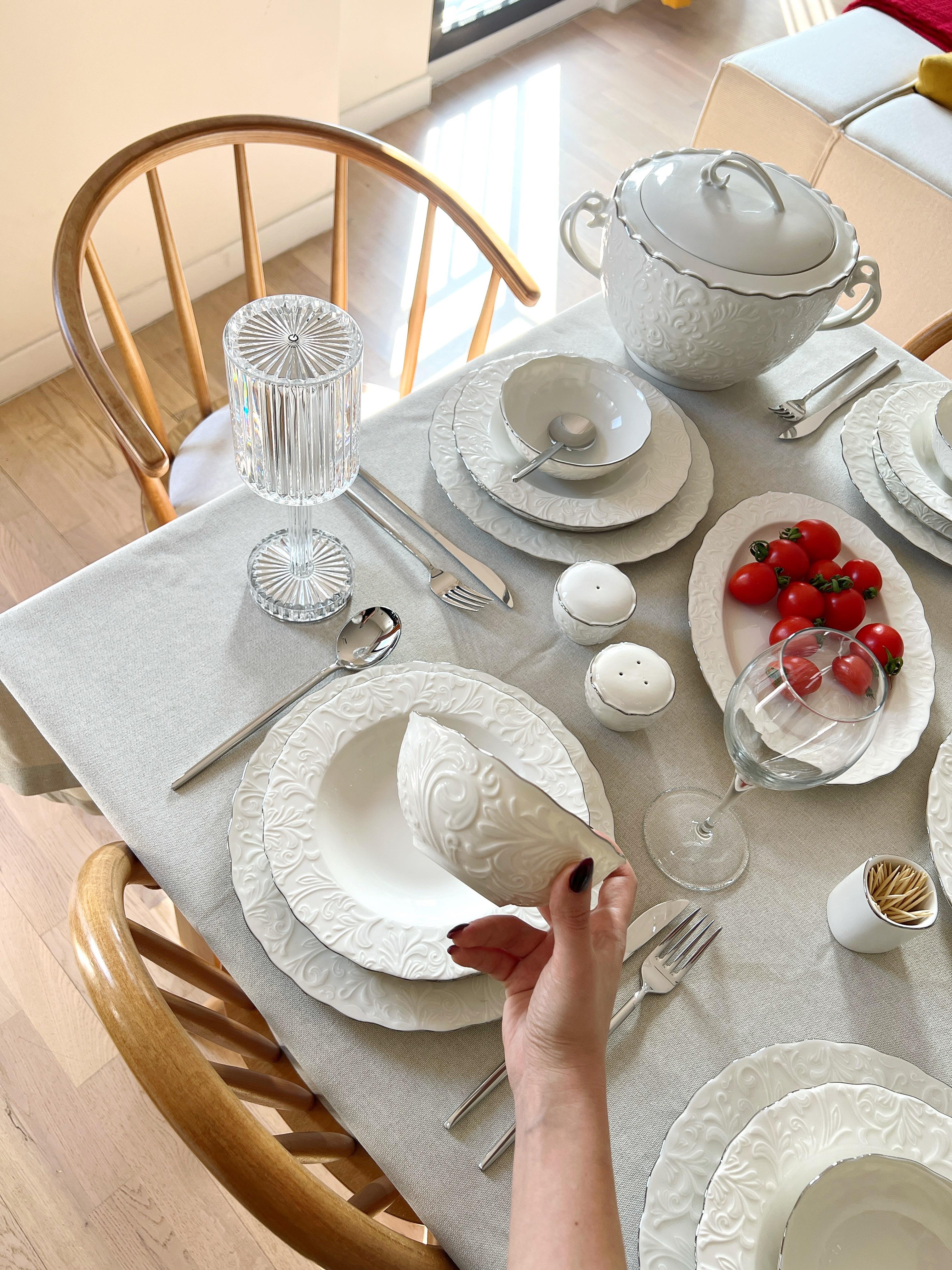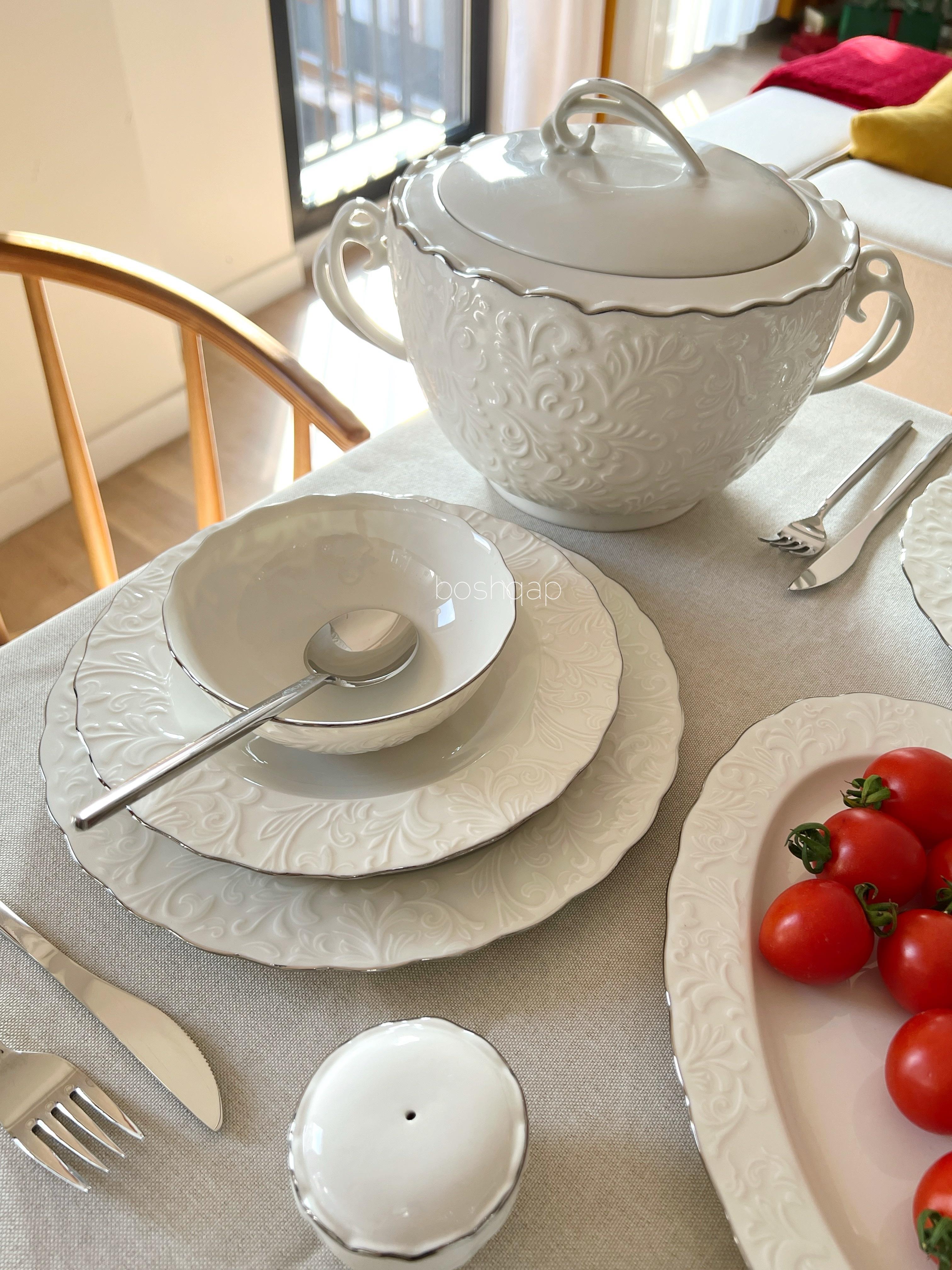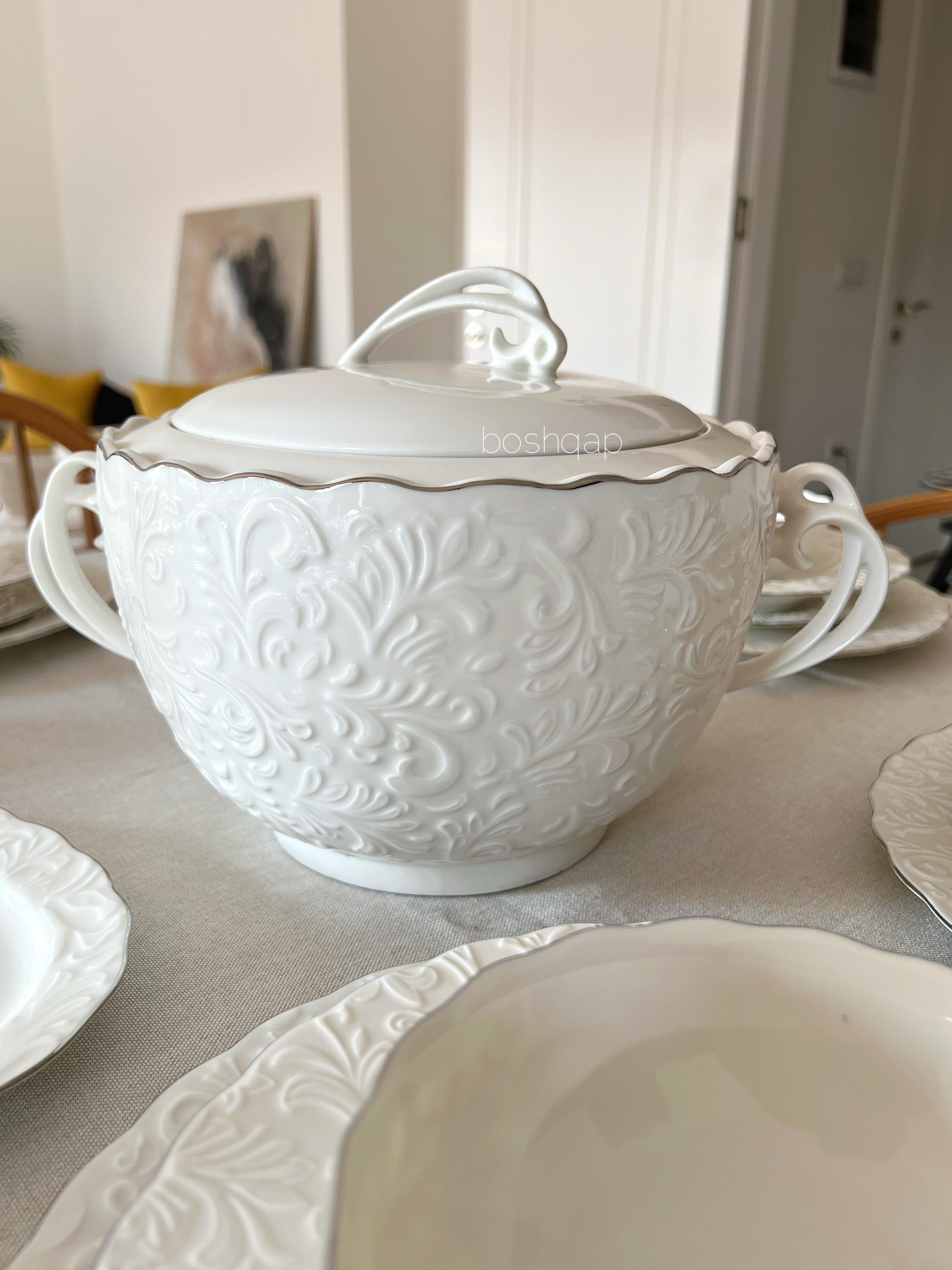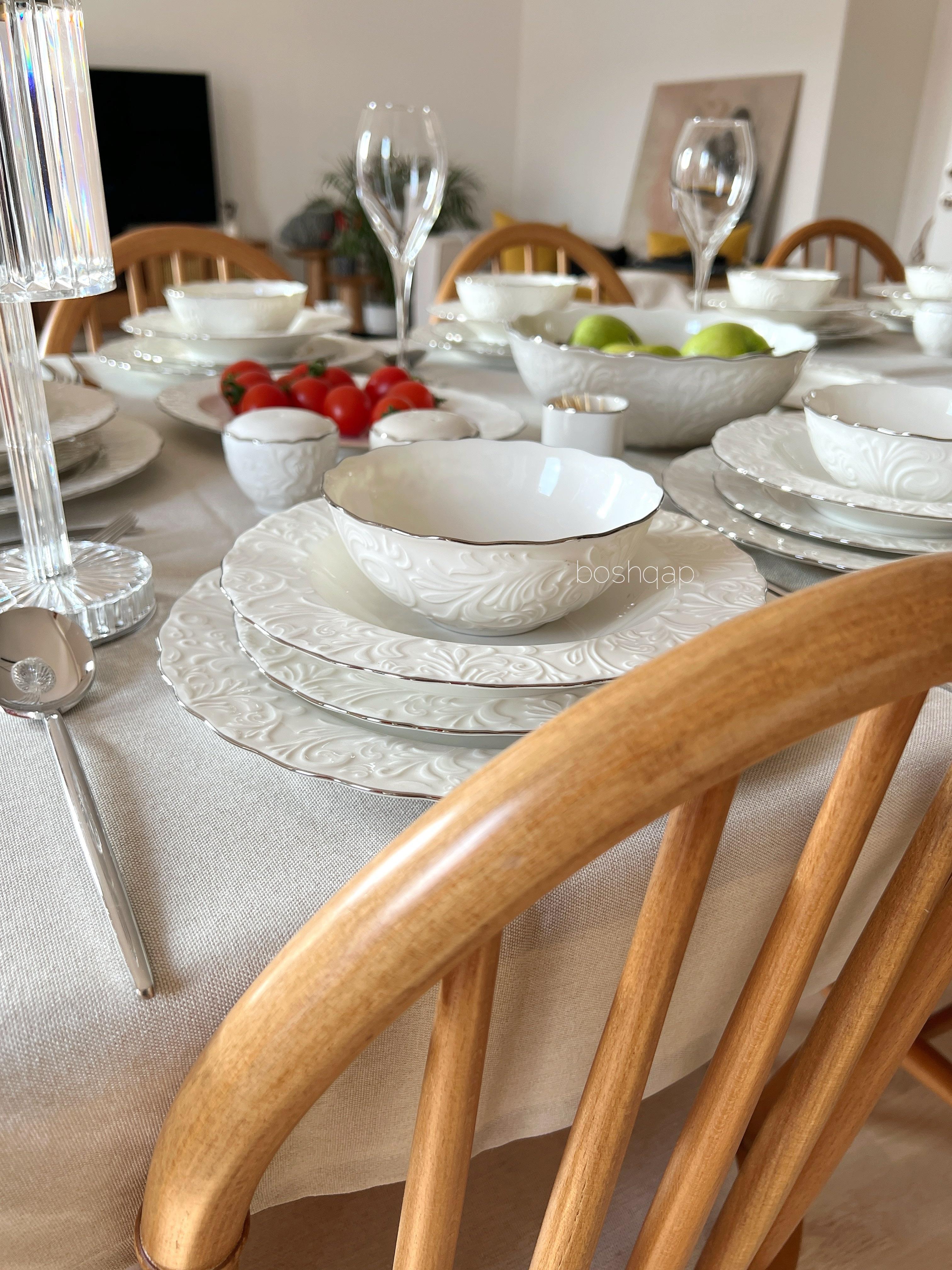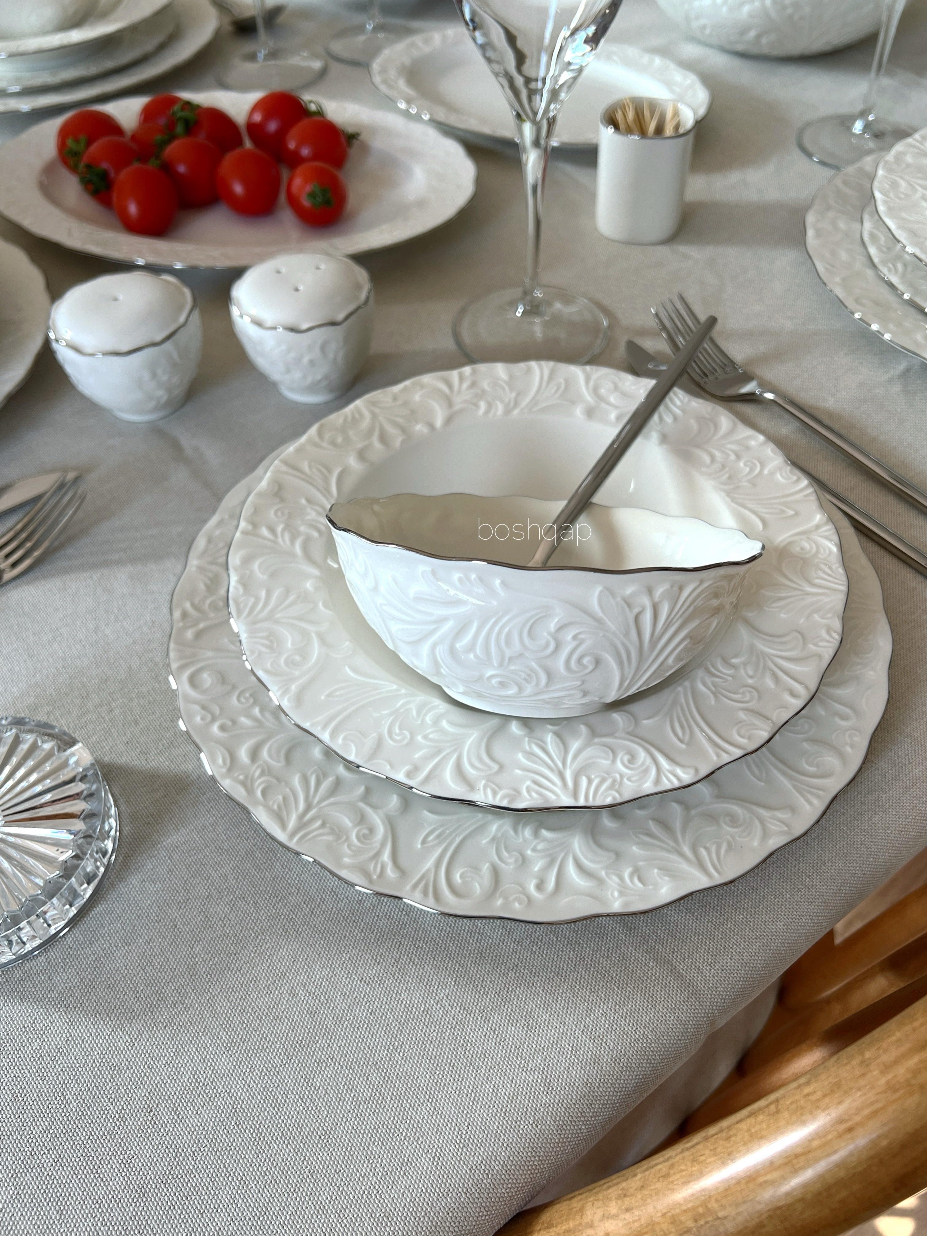 Yaldızların uzun süreli kullanımı açısından bulaşık makinesinde düşük ısı ayarında yıkanması tavsiye edilmektedir. Gerçek gümüş yaldız kullanıldığından yaldızları oldukça dayanıklıdır, çıkmaz ya da soyulmaz. Mısır üretimi 1.kalite ince fine bone porselen malzemedir. Bone China Değildir. Kemik tozu içermez. Gerçek gümüş yaldız kullanılmış olup yaldızlar %100 el işçiliğidir. Kalıp kaynaklı kabartma doku derinliğinde yüzeysel farklılıklar gösterebilir.
